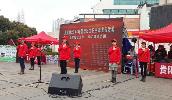 3月15日,我院社会工作专业20名学生在社工系主任常岚老师的带领下参加了贵州省民政厅、贵阳市民政局在贵阳筑城广场举办的2016年国际社工日“发展社会工作,助力扶贫济困”主题宣传活动。