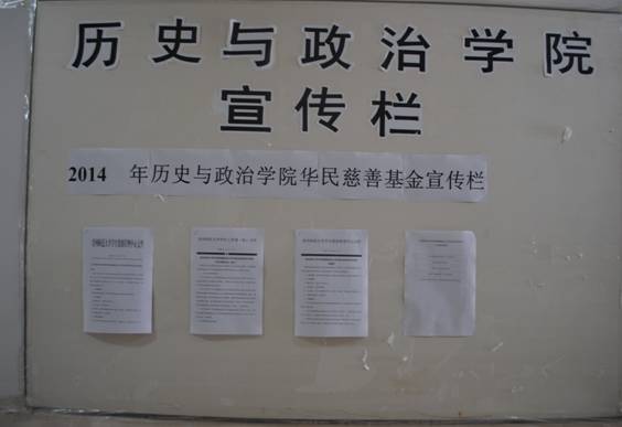 我院在花溪校区专门开辟宣传栏,向广大学生宣传华民慈善基金会大学生就业扶助项目。此外将该通知和相关文件上传到2011级各班群共享,便于学生深入了解相关政策及申报事项。