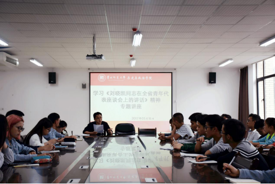 5月16日晚上6点,历史与政治学院在学院楼二楼大会议室举行学习《刘晓凯同志在全省青年代表座谈会上的讲话》精神专题讲座。学院团委、学生会、青分会主要干部,学院各社团负责人,各班班长、团支书参加,会议由学院团委负责人杜进文老师主持。