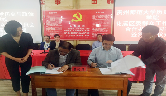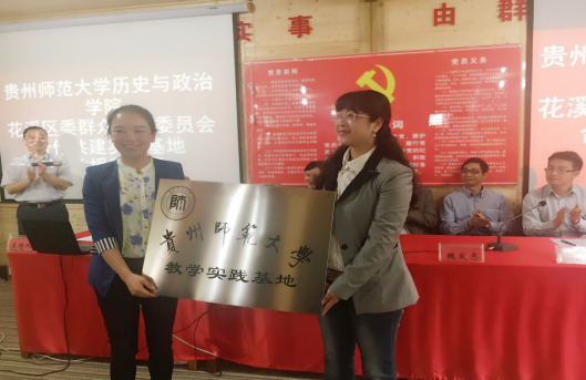 上午12点,历史与政治学院与花溪区久安乡政府签约授牌仪式正式举行,学院副院长蒲文彬与花溪区副区长韩匡时为教学实践基地签约、社工系主任常岚与花溪区群工委副书记李宏进行授牌仪式,在场所有人一致鼓掌表示祝贺。蒲文彬在讲话中向大家介绍了历史与政治学院的院情院史,对久安乡的发展前景表示肯定,对学院和久安乡的长期合作表示诚挚的期待和祝愿。
