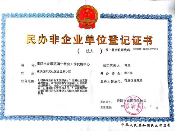 12月7日,由社会工作系教师牵头成立的国仁社会工作发展中心正式取得花溪区民政局颁发的登记证书,标志着国仁社会工作发展中心(以下简称国仁社工)正式注册成立。经过近一年的精心筹备,国仁社工终于在花溪区民政局的大力支持和指导下,取得登记证书,并落户花溪区社会组织孵化基地。