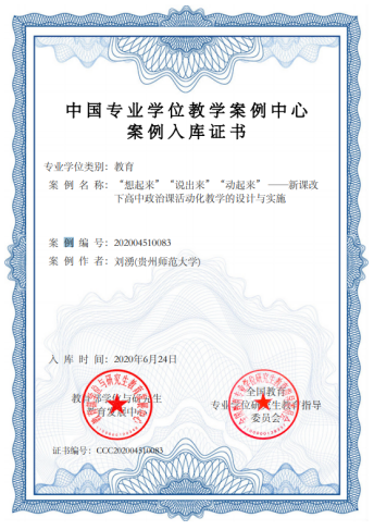 2020年6月,在全国教育专业学位研究生教育指导委员会(以下简称“教指委”)组织开展的第三届全国教育专业学位教学案例征集工作中,我院刘湧老师的教学案例《“想起来”“说出来”“动起来” ——新课改下高中政治课活动化教学的设计与实施》,经过教育部学位与研究生教育发展中心所属专业学位案例中心的严格评审,成功入选中国专业学位教学案例中心案例库。
