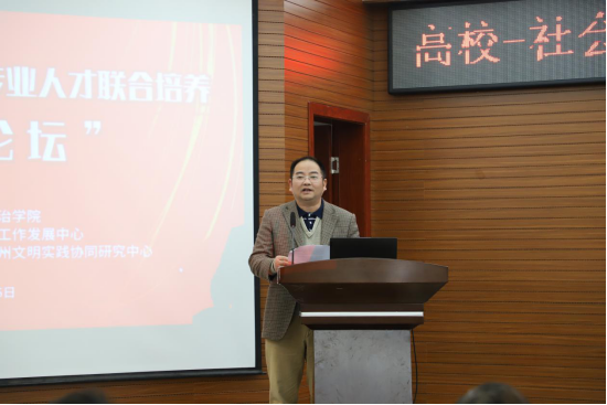 贵州大学公共管理学院党委书记,中国社会工作教育协会副会长、贵州省社会学会会长、贵州省社会工作协会会长庄勇教授进行了题为“校社协同共建社会工作专业人才培育新机制”的主旨演讲。他回顾了贵州社工专业人才培养模式从早期的高校主动嵌入式发展到中期的校社合作“引进来”和建立实习实践基地将学生职业素养教育“重心前移”,再到当前的项目化运作下的“校、政、社”U-G-N三方协同培养模式的发展脉络,指出当前社工教育存在的三大错位并提出相应建议。庄教授最后强调应通过行动研究探索校社联合培养社工专业人才模式的长效机制。