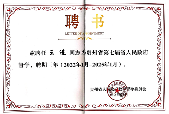 贵州省人民政府教育督导委员会印发了《关于聘任总督学和副总督学的通知》《关于聘任第七届省人民政府督学顾问、督学、特约督导员的通知》,公布了第七届省人民政府督学的聘任名单,其中:督学顾问14人,督学176人,特约督导员40人。我院江明生、王进两位同志被聘为第七届省人民政府督学,聘期三年。