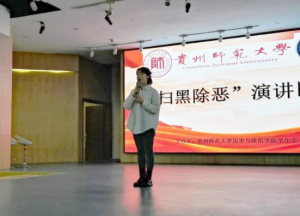 二等奖分别被两位同学收入囊中,来自17思政班的欧晓珊同学,以启发式的提问“你们对本次演讲比赛主题了解多少”开始她的演讲,她以身边的例子,因公牺牲的贵筑社区洛平村民警马金涛的事件展开演讲,循着她的演讲,我们认识了解了奋斗在第一线的民警马金涛,也因他的事件,知道了黑暗离我们并不遥远,欧晓珊同学通过这样叙事性强独具感染力的演讲,赢得了评委们的高分和观众们的掌声。