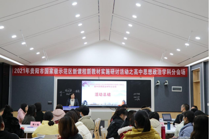 课后,两位老师进行了简短的说课,陈金锋老师认为:要注意教学的参与与生成属性,要把高屋建瓴的理论转化为学生能听懂、能理解的知识,必须要强调教学的设计感、距离感以及亲切感;潘老师则认为教学要注重启发性,通过教师有目的、有计划的引导,使学生对于知识的认识层层递进、逐步深入,犹如抽丝剥茧一般使学生自主建构知识。师大马克思主义学院的专家与贵阳六中的教研组组长在教师说课后指出:当今社会发展迅速,知识的迭代越来越快,教师若想做到与时俱进必须不断更新自身的教学理念,完善自身的知识体系,在传授学生“是什么”、“怎么样”的同时自身还要多问自己几个“为什么”,这样教师才能成为一股活水,源源不断地为学生提供帮助;最后,政治教研员石松老师对本次教研活动作了总结与评价:新课程与新教材对教师与学生而言都是一个全新的挑战,教师要想适应这种新变化就要转变旧观念,养成终生学习的良好习惯,这样才能在新形势下继续上好思政课。会后,与会者分别合影留念,教研活动取得了圆满成功。