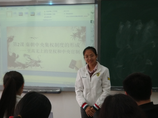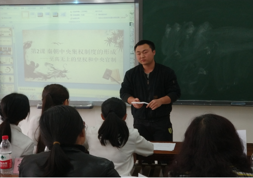 历史组大赛评委由廖光珍、龚大明、徐杨、王雅克、王艳玲五位老师担任,思政组由蒲文彬、王文惠、伍志燕、龚春芳、罗连祥五位老师担任。通过班级PK和年级PK竞赛下来,历史组和思政组各有6组同学参赛,每组有5位成员,每位成员负责大赛中的一个环节。比赛共分5个环节:说课、授课、评课、讲演、答辩。各个环节时间依次限为3分钟、15分钟、3分钟、3分钟、2分钟。评委们从教师口语、教态、教学设计、教学方法、多媒体运用、板书设计等多方面对选手进行综合考核。