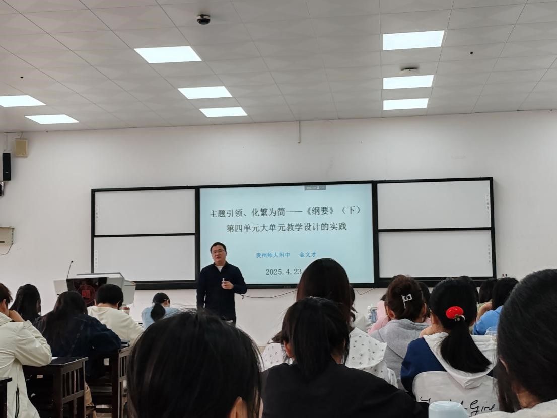为增进学生对教材的理解,精进学生教学技能,4月23日14时,2023级和2024级历史学班参加了中学历史教学前沿系列讲座(二),贵州师大附中金文才老师担任主讲人,讲座题目是:主题引领、化繁为简——《纲要》(下)第四单元大单元教学设计的实践。