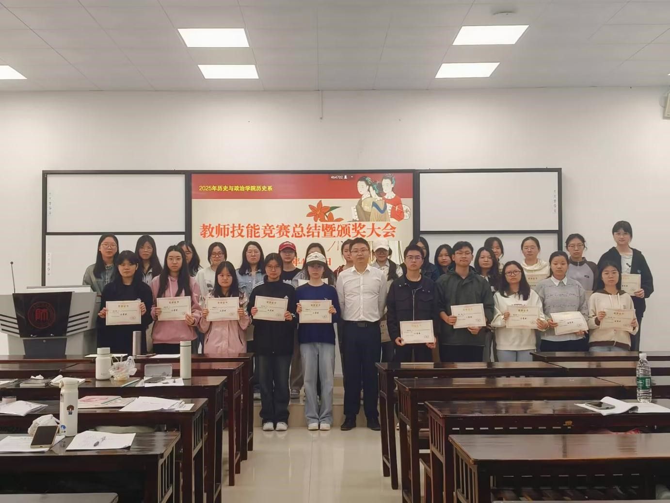 大会伊始,王老师对同学们在本次教学技能竞赛中的表现作点评,他充分肯定了选手们的精彩表现,赞扬了大家踊跃参与的积极态度,也指出了同学们在比赛中的不足之处并给予建议,勉励大家继续努力,不断精进教学技能。随后,王老师为获奖的选手们颁奖,同学们纷纷鼓掌祝贺,会议在大家合影留念后落下帷幕。